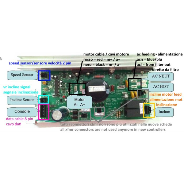 Attenzione: le schede fornite sono testate e funzionanti al 100%. In caso di anomalie successive al montaggio, soprattutto se il motore sembra non avere forza o girare in modo anomalo NON utilizzare il tapis e provvedere alla verifica ed eventuale sostituzione del motore o del nastro.